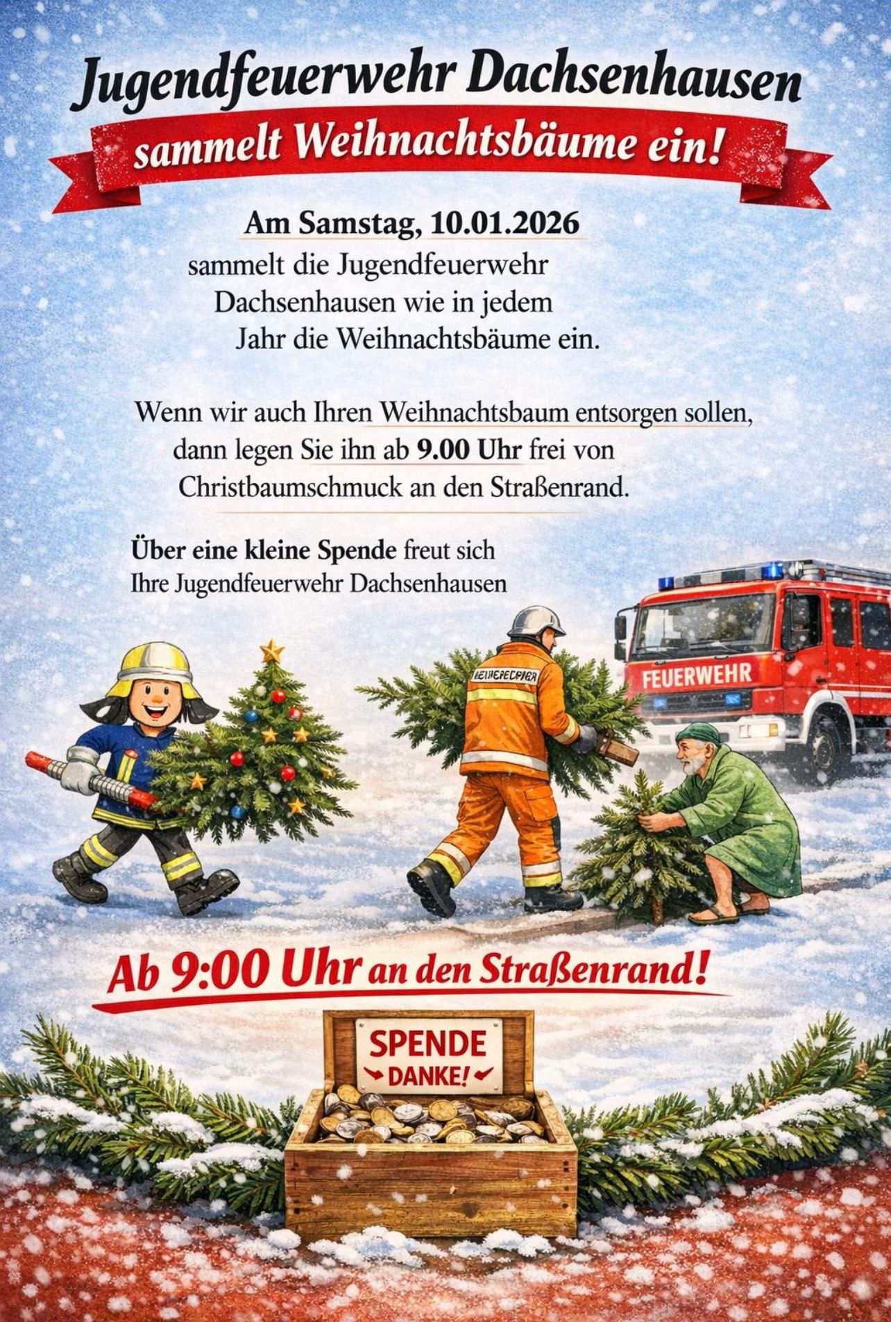 Am Samstag, 10.01.2026 sammelt die Jugendfeuerwehr Dachsenhausen wie in jedem Jahr die Weihnachtsbäume ein.